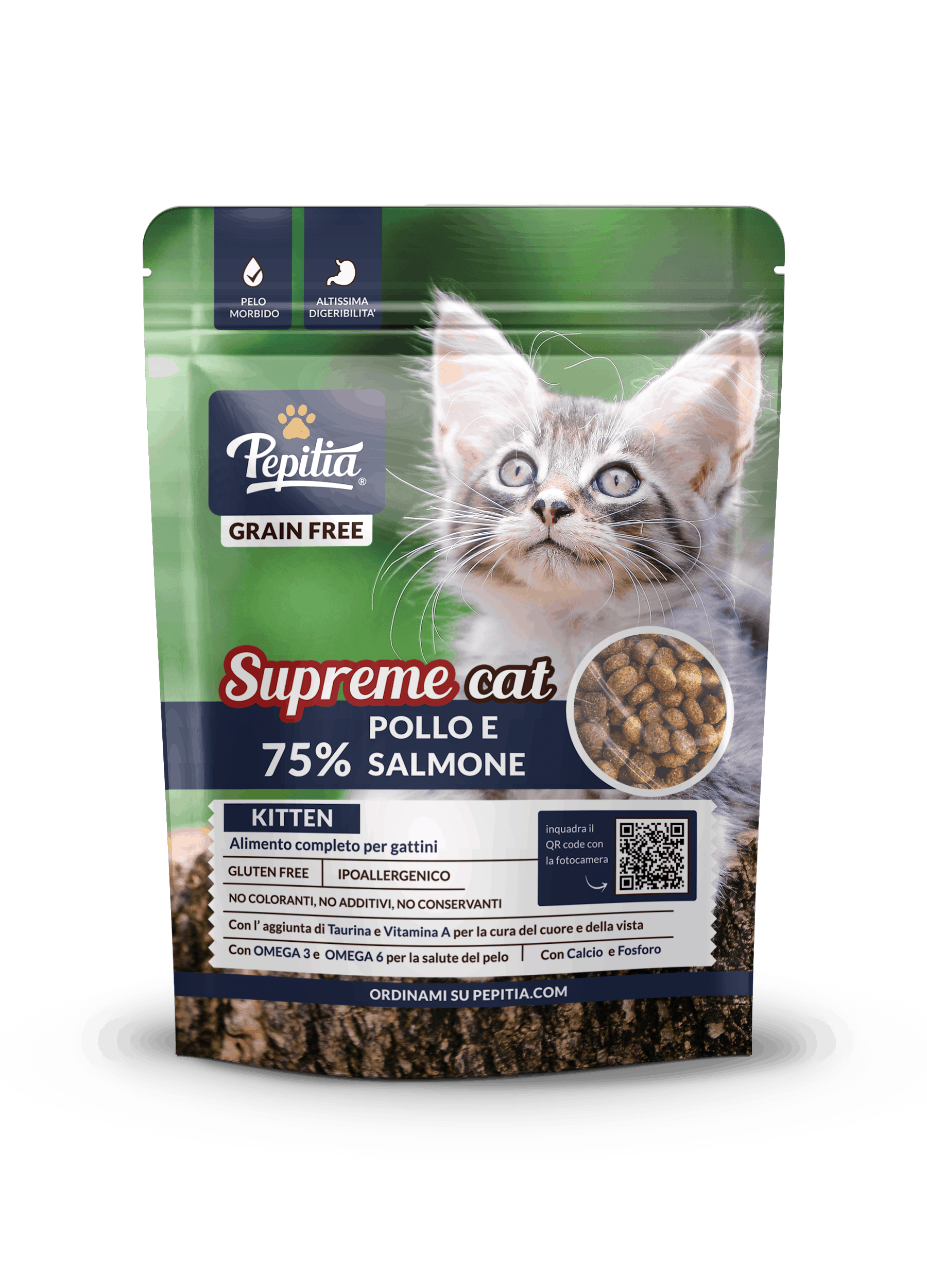 La ricetta Supreme Cat Kitten Grain Free di Pepitia® comprende una selezione delle migliori fonti di proteine animali, ingredienti di altissima qualità e di primissima scelta altamente digeribili.